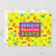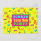 Postal de invitación de vacaciones de verano con colores brillantes y tropicales. La huella de verano contiene chanclas, gafas de sol, palmeras y conchas. El texto "fiesta de vacaciones de verano" en la parte delantera es una plantilla. En la parte posterior, incluir un párrafo con información fiesta impresa en negrita azul acua. Utilícelo para un fiesta de final de año de clase BBQ o pool, u otra reunión para niños.