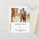 Boda contemporáneo y moderno gracias postal que incluye un diseño simple y mínimo con "Gracias" junto con sus nombres y fecha boda en tipografía en negrita debajo de su foto favorita. La parte posterior tiene tu mensaje personalizado. Este minimalista boda tipográfico en blanco y negro gracias a la postal puede ser personalizado a cualquier color que elija en la herramienta de edición de diseño.