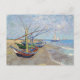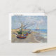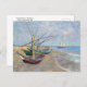 A fine art postcard with the post-impressionist painting, Fishing Boats on the Beach at Les Saintes-Maries-de-la-Mer (1888) by Vincent van Gogh (1853-1890) Four boats moored on the sand at the water's edge.