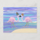Ilustracion de dos flamencos que se colocan en una playa que lleva los gorras hechos punto.