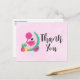 Un fiesta te agradece postcard un caprichoso dibujo de un flamingo rosado caliente con sandías y piñas. Summery y tropical. El fondo es rosa claro. Mensaje personalizado en la parte de atrás.