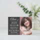 Las imágenes de pizarra son siempre populares, y este diseño elegante no es una excepción. Su fotografía (en blanco y negro o en color) está en el lado derecho, con su texto personalizado y un separador de flecha de pizarra de bonito a la izquierda. La parte posterior de la tarjeta tiene un campo de texto adicional si es necesario. Todo el texto en la parte delantera también se personaliza fácilmente.