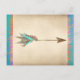 Una flecha rústica con floral y plumas turquesa sobre un fondo beige texturado, con un colorido diseño tribal de neón.