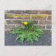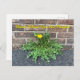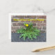 Envía algo de aliento y positividad con esta postal que muestra una foto de una flor de diente de león creciendo contra una pared de ladrillo con el mensaje "Bloom Where You Are Planted" en letras amarillas.