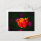 Flor de tulipán rojo brillante sobre fondo verde oscuro y manchas borrosas rosadas de otras flores de tulipán. Bol de fuego, copa de luz solar viva. El símbolo de la nueva vida. ¡Brilla, ilumina, irradia e inspira!