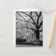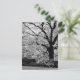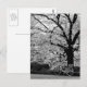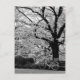 Una fotografía en blanco y negro de una bicicleta aparcada frente a un gran cerezo en flor en una calle de Tokio, Japón.