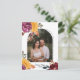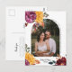 Esta tarjeta postal de agradecimiento de boda de otoño con una foto de la pareja presenta flores de acuarela en negrita en burgundy y naranja quemada, perfecta para bodas boho, rústicas o de jardín.
