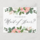 Invite a sus amigos y familiares a ser su criada de honor con nuestra elegante tarjeta Rubor Spring Floral "¿Serás mi empleada de honor?". La tarjeta de honor cuenta con un borde superior de flores acuáticas y vegetación en tonos rosa rosa, blanco y verde. Añadir un mensaje personal en la parte posterior. Diseñado para coordinar con nuestra colección de bodas florales Rubor Spring.