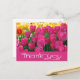 ¡Di gracias con flores! Esta postal floral dulce cuenta con un campo de vibrantes flores de tulipán rosadas y amarillas con un borde rosa negrita que resalta un saludo de agradecimiento con un divertido tipo de letra de corazón blanco. Las postales son la alternativa económica a las tarjetas de felicitación de tamaño completo cuando se desea enviar una nota de agradecimiento. Las postales cuestan menos que las tarjetas y requieren menos franqueo. Floral Gracias las postales son excelentes para muchas ocasiones: Mostrar aprecio por los regalos Actos de bondad Empresas Bodas y duchas de novias Organizaciones benéficas, recaudadores de fondos, eventos públicos Otros productos y regalos que puede disfrutar...