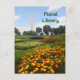 The Floral Library or Tulip Library is a 93 bed garden inspired by Lady Bird Johnson who founded the Society for a More Beautiful National Capital which included the planting of flowers. In the spring the beds are filled with tulips and are later replaced with annuals like the yellow marigolds in the foreground. A faint silhouette of the Washington Monument can be seen in the distance under a bright blue sky.