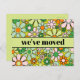 Tarjeta de nueva dirección floral retroprimaveral / Nos hemos mudado. Flores alegres y primaverales con una estética divertida y vintage y un ambiente de los años 60 y 70, en colores pastel brillantes y bonitos. El texto se puede personalizar. De Kierkegaard Design Studio.