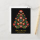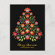 La parte delantera de la postal cuenta con una impresionante escena de vacaciones. Contra un fondo negro profundo y aterciopelado, un majestuoso árbol de Navidad ocupa el centro del escenario. El árbol no se compone de ramas tradicionales siempre verdes, sino más bien de una vibrante variedad de flores de inspiración folclórica cuidadosamente elaboradas. Estas flores, en tonos rojos ricos, amarillos oscuros, lavanda delicada, melocotón suave y azul de pizarra muda, se entrelazan perfectamente para formar la forma del árbol. El estilo de corte de las flores le da un toque caprichoso, creando un efecto visual encantador. El detalle intrincado de cada pétalo y hoja añade profundidad y textura, mientras que las hojas verdes del bosque proporcionan un contraste natural a las flores vívidas. En general, esta postal resume la magia de los Navidades a través de una fusión única de flores inspiradas en el folclore y de imágenes tradicionales de vacaciones. Promete despertar sentimientos de calidez, nostalgia y asombro en el destinatario.