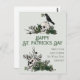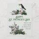 Esta única postal del Feliz Día de San Patricio presenta elementos irlandeses dibujados a mano con tinta negra: rosas verdes, hojas, tréboles, cráneos, flores silvestres y un cuervo. Mensajes editables delante y atrás. Todo el texto es editable.