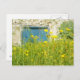 Flores de acuarela amarillas en flor con puerta de madera azul y pared de piedra