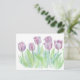 Postal de bonito con lavanda y tulipanes malvas pintados en acuarela. ¡Hermosas flores primaverales!