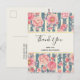 Gracias postal con un hermoso patrón de flores rosadas bonito sobre un patrón a rayas compuesto de rayas azules y crema. Un marco rectangular con un borde falso de Relieve metalizado dorado sobre la parte superior con su texto personalizado dentro.