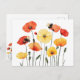 Postal de personalizable para múltiples ocasiones con flores de amapola doradas amarillas y brillantes rojas y naranjas. En las flores aparecen dos abejas con burbujas. En el reverso de la tarjeta postal aparece el mismo ilustracion oculto por la línea de firma del personalizable.