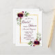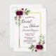 Delante: fondo blanco con un marco de oro falso. Decorado con flores de color burdeos oscuro, rosas, plumas de estilo boho y vegetación. Plantillas para el nombre de la novia y detalles del fiesta. El nombre y el texto: Bridal Shower están escritas con un guión de estilo con letras a mano, letras de color borgoña. Fondo blanco y rosas.