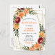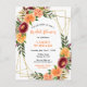 Esta divertida y caprichosa tarjeta postal de la ducha de matrimonio tiene flores color burdeos y naranja con follaje en un marco geométrico dorado. El texto combina el guión manuscrito y las fuentes serif para un aspecto elegante y moderno. Es perfecto para una ducha de novia rústica en otoño.