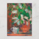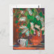 Postal con pintura pastel de estilo impresionista, vida residual primaveral - ramas florecientes de árbol de aves con flores blancas brillantes y hojas verdes frescas en tarro de arcilla y tazón de café sobre manteles a rayas. © Julia Khoroshikh 2020 www.juliakhoroshikh.art #pastelpainting #floralpainting #moderfloral #birdcherry #birdcherrytree #whiteflowers #postcards #greetingcards #zazzle #zazzlemade