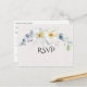 Una hermosa tarjeta RSVP matrimonial sobre un fondo blanco con una flor de acuarela azul y blanca Este RSVP forma parte de una suite de productos que se ajustan al diseño. Este diseño es perfecto para una boda más elegante en una iglesia.