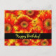 cumpleaños feliz con flores. Diseño floral brillante y audaz de primavera con daisies gerbera amarillos y naranjas. Esta imagen vibrante y colorida contiene amarillos brillantes de mango, naranja intenso y rojos intensos e intensos que brotan realmente. El mensaje en la parte delantera y en la parte posterior puede ser personalizado por usted. El mensaje dice: ¡Feliz cumpleaños! Los mejores deseos para un cumpleaños maravilloso y que el año que viene esté lleno de muchas cosas buenas.