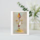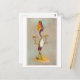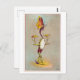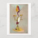 Esta postal muestra una reproducción de un ilustracion victoriano vintage que muestra una rana circense caminando mientras balancea una flor en cada mano y una mariposa en su cabeza.