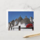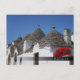 Postal con flores de geranio rojo y una hilera de casas de trullos tradicionales en forma cónica con techos de piedra en una calle de la ciudad de Alberobello en Puglia, sur de Italia, con un bar que se desvanece y el texto 'Puglia'.