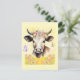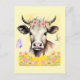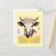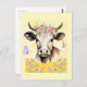 Hermosa postal de vaca con una vaca florida, mariposa y libélula, sobre un fondo amarillo carnicero. Encantador para alguien que ama a las vacas.