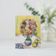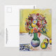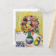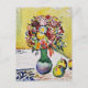 Postal de arte fino con el cuadro Flores de vida fija y tres manzanas (1910) del artista expresionista alemán August Macke (1887-1914). Un ramo de flores silvestres colocado en un jarrón verde sobre una mesa con fruta de fondo amarillo.