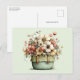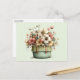 Una postal con una maceta de flores caprichosa y elegante. Colores verde, rosa y crema. Puesta en una maceta verde con un paño a cuadros. Ambiente shabby vintage.