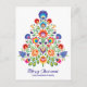 En la parte frontal de esta postal se despliega un impresionante tableau navideño ambientado en un fondo blanco prístino. Llamando la atención está un árbol de Navidad regio, erguido orgullosamente en medio del lienzo nevado. Este árbol, sin embargo, diverge de la convención, ya que está adornado no con ramas de hoja perenne, sino con una brillante variedad de flores inspiradas en el folclore meticulosamente elaboradas, que evocan la forma de arte tradicional polaca conocida como "wycinanki".