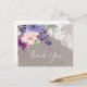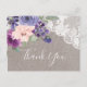 Esta postal es perfecta para una boda de campo. El diseño rústico de la moda cuenta con un bonito arreglo de flores de ciruela morada, lila y rosa rubor con encaje floral blanco sobre un elegante fondo de lino. Personaliza la parte posterior de la tarjeta postal con tus nombres, tu dirección de retorno y un mensaje de agradecimiento. Como alternativa, deje en blanco la sección de plantillas de mensajes de agradecimiento para escribir a mano una nota personalizada cuidadosa en cada tarjeta después de su llegada. Estas tarjetas se pueden usar para un boda, una ducha de novia o cualquier evento especial.