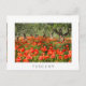 Foto postal de un campo con flores rojas de amapola bajo viejos olivos en un huerto en el campo de Italia en verano con una frontera blanca y el texto 'Toscana'.