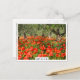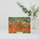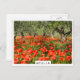 Foto postal de un campo con flores rojas de amapola bajo viejos olivos en un huerto en el campo de Italia en verano con un borde blanco y el texto "Apulia".