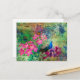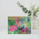Postal con un elegante cuadro vintage de un pavo real azul y verde azulado sobre un fondo musical con flores color de agua rosa brillante.