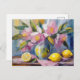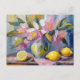 Un bonito cuadro de arte moderno con un estilo impresionista, en el que reina una vida quieta de flores y limones vibrantes, expresados a través de pinceles texturados en tonos rosa pastel, azul y amarillo. Los colores suaves y armoniosos crean un ambiente tranquilo, mientras que los tejidos vivos aportan profundidad y movimiento a la composición. Esta pieza fresca y contemporánea capta la belleza de la naturaleza, mezclando elementos florales y frutales de forma elegante.