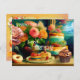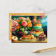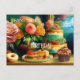 Postal colorida y festiva con pasteles y flores. Un delicioso regalo de cumpleaños.