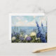 Una suave pintura floral costera en pastos claros, con flores moradas, azules y blancas con una delicada vegetación y una tranquila vista al mar a lo lejos, perfecta para casas de estilo costero o de cabaña.