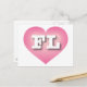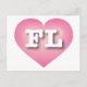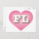 Esta postal tiene un vibrante corazón rosado con un centro blanco lavado que contiene las negritas letras blancas altas del funda FL, la abreviatura oficial de Florida, el estado del sol. El lado inverso de la postal está en blanco, a la espera de tus sentimientos escritos a mano o de tu texto personalizado.