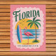 Disfrute del sol con esta deliciosa postal de Florida, con una encantadora escena de playa retro y el orgulloso título "EL ESTADO SOLÁRIUM". Este vibrante ilustracion de inspiración vintage capta perfectamente las tranquilas y tropicales vibraciones de Florida, Estados Unidos, mostrando un elegante flamenco rosa en las costas arenosas, una palmera clásica y una tabla de surf fresca. Los colores vivos y el diseño lúdico evocan recuerdos de días de verano interminables y de relajación costera.