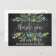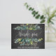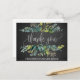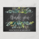 Esta tarjeta postal es perfecta para un boda rústico. El diseño presenta un marco de hojas verdes y productos vegetales en un fondo de pizarra gris de carbón. Personalice la parte delantera de la tarjeta con un mensaje corto. Personalice la parte posterior con un mensaje de agradecimiento más largo. Como alternativa, deje en blanco la sección plantilla de mensajes de agradecimiento para escribir a mano una nota personalizada en cada postal después de su llegada. Estas postales se pueden usar para la ducha de novia, el boda o cualquier evento especial.