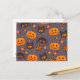 Patrón de halloween super lindo. En este ilustracion se pueden ver calabazas, arañas, búhos, estrellas y dulces. El diseño del patrón está en el fondo de un punto de polka morado.