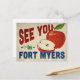 Una encantadora postal de viaje vintage de Fort Myers Florida con una hermosa manzana roja, junto con un divertido texto de estilo retro que dice: "Nos vemos en Fort Myers"