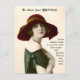 Tarjeta de felicitación de cumpleaños antigua. Mujer joven con sombrero y vestido de moda vintage. "Para felicitar tu cumpleaños" en la parte superior en tipografía victoriana. "Todos los deseos más dulces que puedo recordar; Aquí para felicitar tu cumpleaños Con mi amor, lo encontrarás"