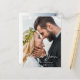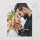 En la parte delantera: añade tu propia foto boda, retrato/tamaño vertical. Con el texto: Gracias escrito con un gran guión de estilo moderno y a mano. Plantillas para sus nombres y fecha de boda. Texto blanco. Atrás: degradado azul polvoriento como fondo. Plantilla para su nota de agradecimiento. Texto negro. ¡Ideal para una boda de invierno o de playa!