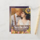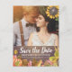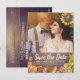Guardar las plantillas de postales de fotos de la invitación a la boda de la fecha - Elegantes hojas de arce de otoño, calabazas y flores de agua de girasol sobre fondo de madera rústica. ¡Un Diseño Perfecto Para Tu Gran Día! Todos Los Estilo De Texto, Los Colores Y Los Tamaños Se Pueden Modificar Para Ajustarse A Sus Necesidades.