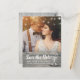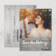 Guardar las plantillas de postales de fotos de la invitación a la boda de la fecha - Elegante guión de letras, Vintage Champagne Glasses y String Lights sobre fondo rústico de madera. ¡Un Diseño Perfecto Para Tu Gran Día! Todos Los Estilo De Texto, Los Colores Y Los Tamaños Se Pueden Modificar Para Ajustarse A Sus Necesidades.