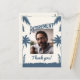 Envía un agradecimiento sincero con esta tarjeta postal de tema tropical! Con elegantes siluetas de follaje en tonos azules y beige, con una foto personalizable y las palabras 'jubilación' y 'gracias', esta tarjeta es la forma perfecta de expresar gratitud por tu celebración de jubilación. Comparte tu aprecio con amigos y familiares con estilo!