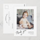 Tarjeta postal de agradecimiento fotográfico hermosa y moderna para agradecer a amigos y familiares por los regalos y el apoyo recibido durante tu baby shower. El diseño presenta una sola foto personalizable dentro de un marco blanco y tipografía moderna manuscrita.